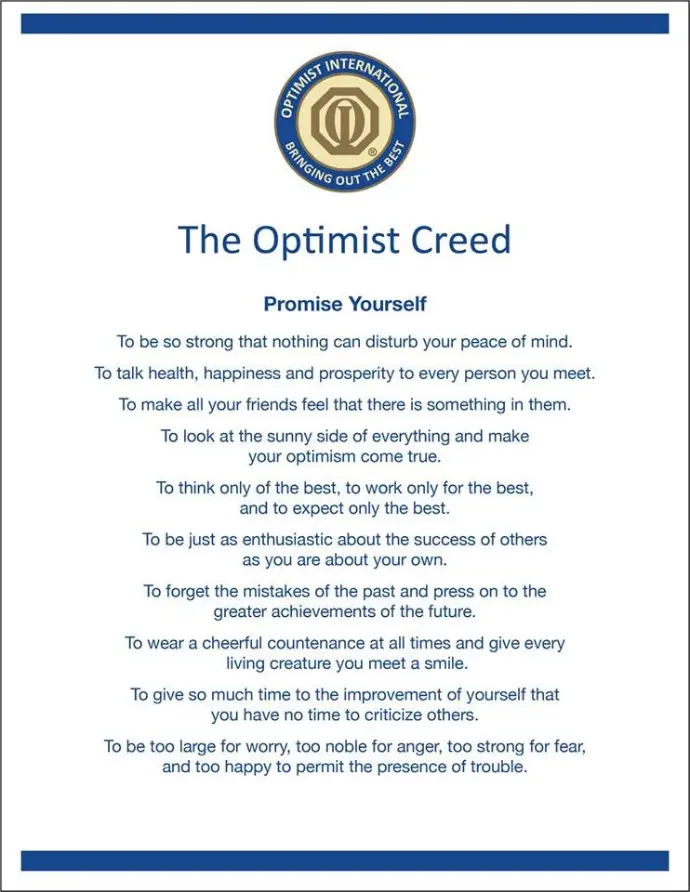 The Optimist Creed is an inspirational and motivation statement of value. The Optimist Creed was adopted by Optimist International in 1922 and is used as a final closing statement in Optimist Club meetings around the world. The creed was originally written by Christian D. Larson with the title "Promise Yourself."